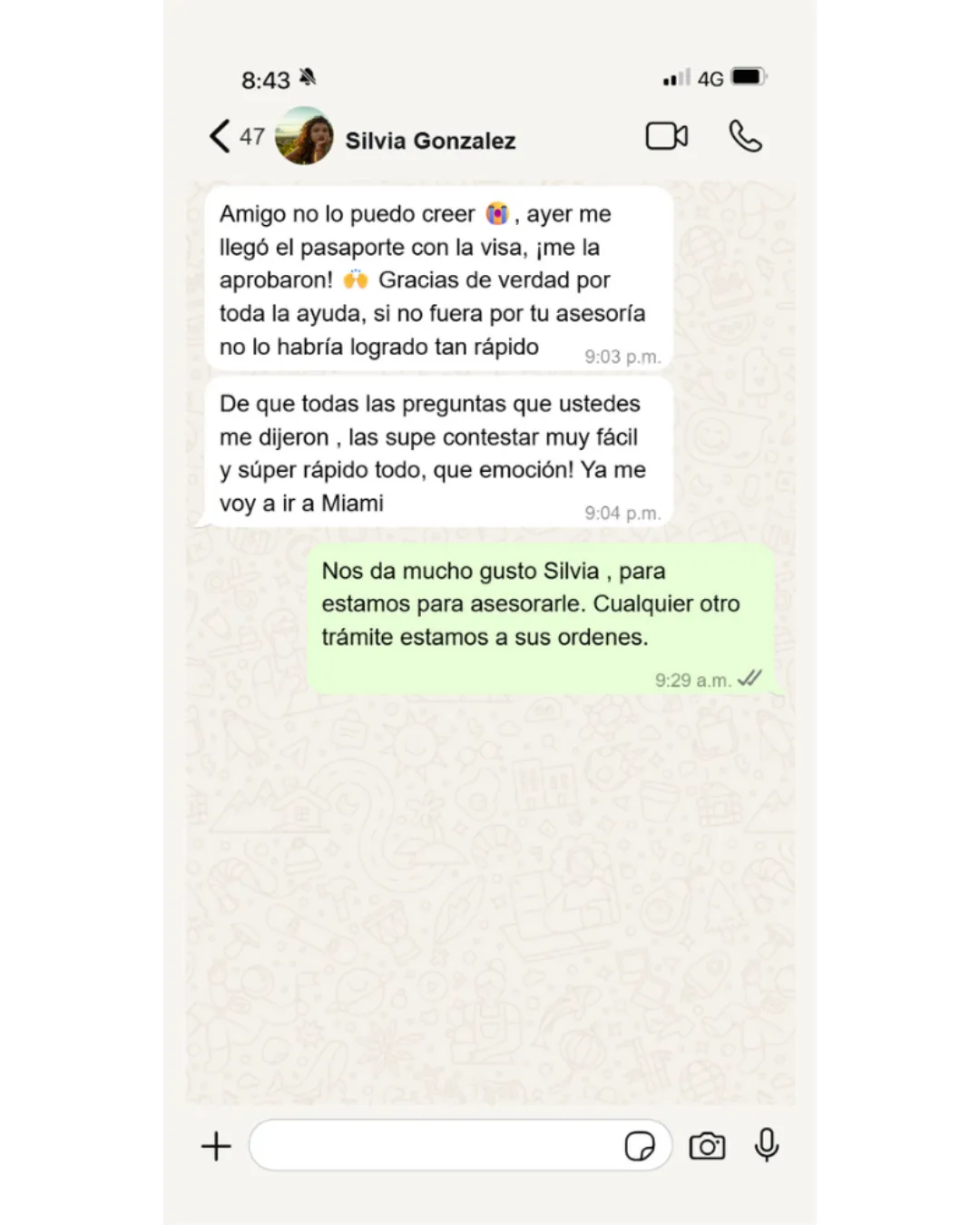 Pensé que el trámite sería complicado, pero desde el primer mensaje me explicaron todo súper claro. Me ayudaron con el DS-160, me prepararon para la entrevista y todo avanzó rapidísimo. No hubo errores ni complicaciones, y la entrevista fue muchísimo más sencilla de lo que imaginé. A los dos días ya tenía mi visa aprobada. Excelente servicio